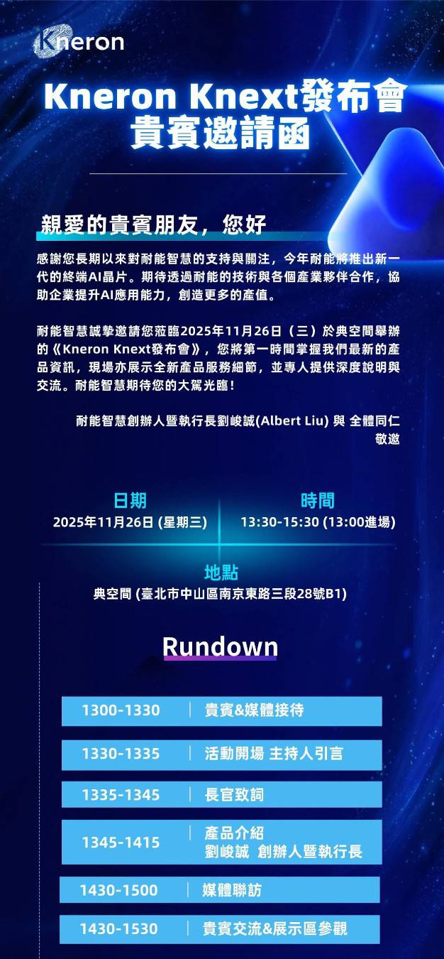 Kneron will host a Media and Industry Communication Forum on November 26, bringing together media partners and industry professionals. During the event, we will share our latest technological advancements, strategic developments, and future vision, as well as insights into key trends shaping the AI and semiconductor industries. We sincerely invite you to join us in exploring new opportunities in the era of AI.