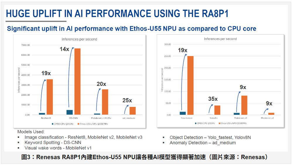 RA8P1內的Cortex-M85已達驚人的1GHz運作時脈,即便不使用AI硬體加速功能也具有極家的效能,而內建的Ethos-U55 NPU更是如虎添翼,可以讓各種AI推論工作提升9倍至35倍不等的效能。