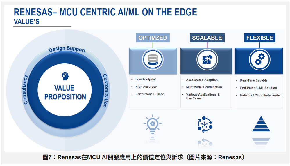 最後,Renesas期望讓開發者以MCU進行Edge AI相關開發,且開發能夠兼顧最佳化(Optimized,或稱優化)、擴展延伸性(Scalable)以及彈性(Flexible)等三面向。